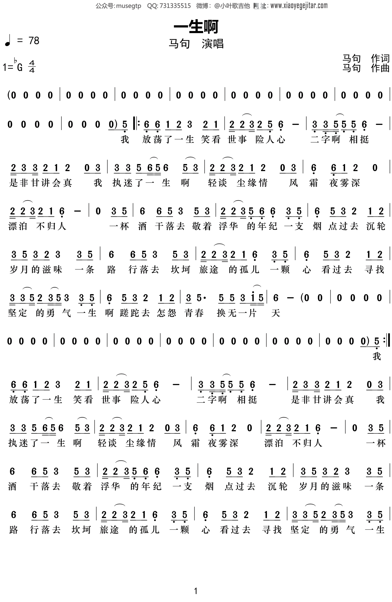 017【简谱】马句《一生啊》钢琴谱单音独奏谱