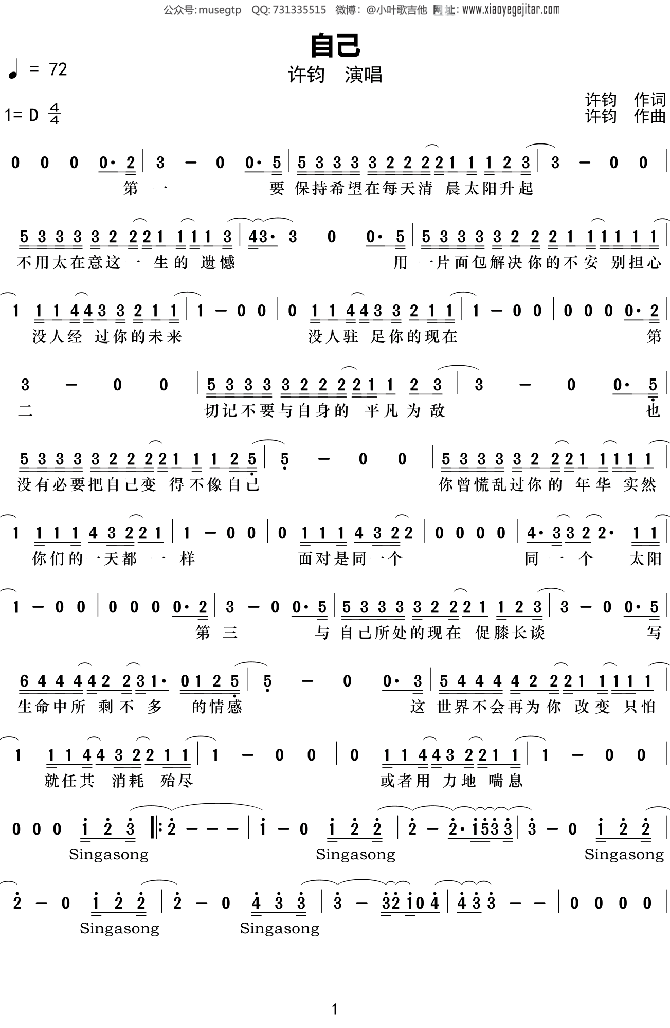 030【简谱】许钧《自己》钢琴谱单音独奏谱